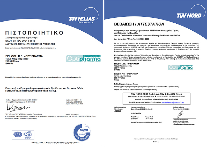 - Γνωστοποίηση κυκλοφορίας ιατροτεχνολογικών προϊόντων για όλα τα γυαλιά READERS στο Εθνικό Μητρώο Ιατροτεχνολογικών Προϊόντων του ΕΟΦ (GREMDIS) με REGISTRY CODE: 800969880.